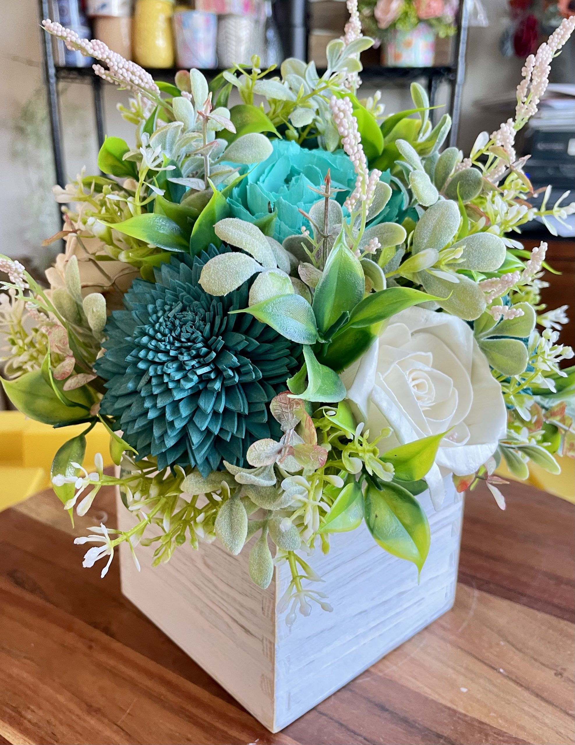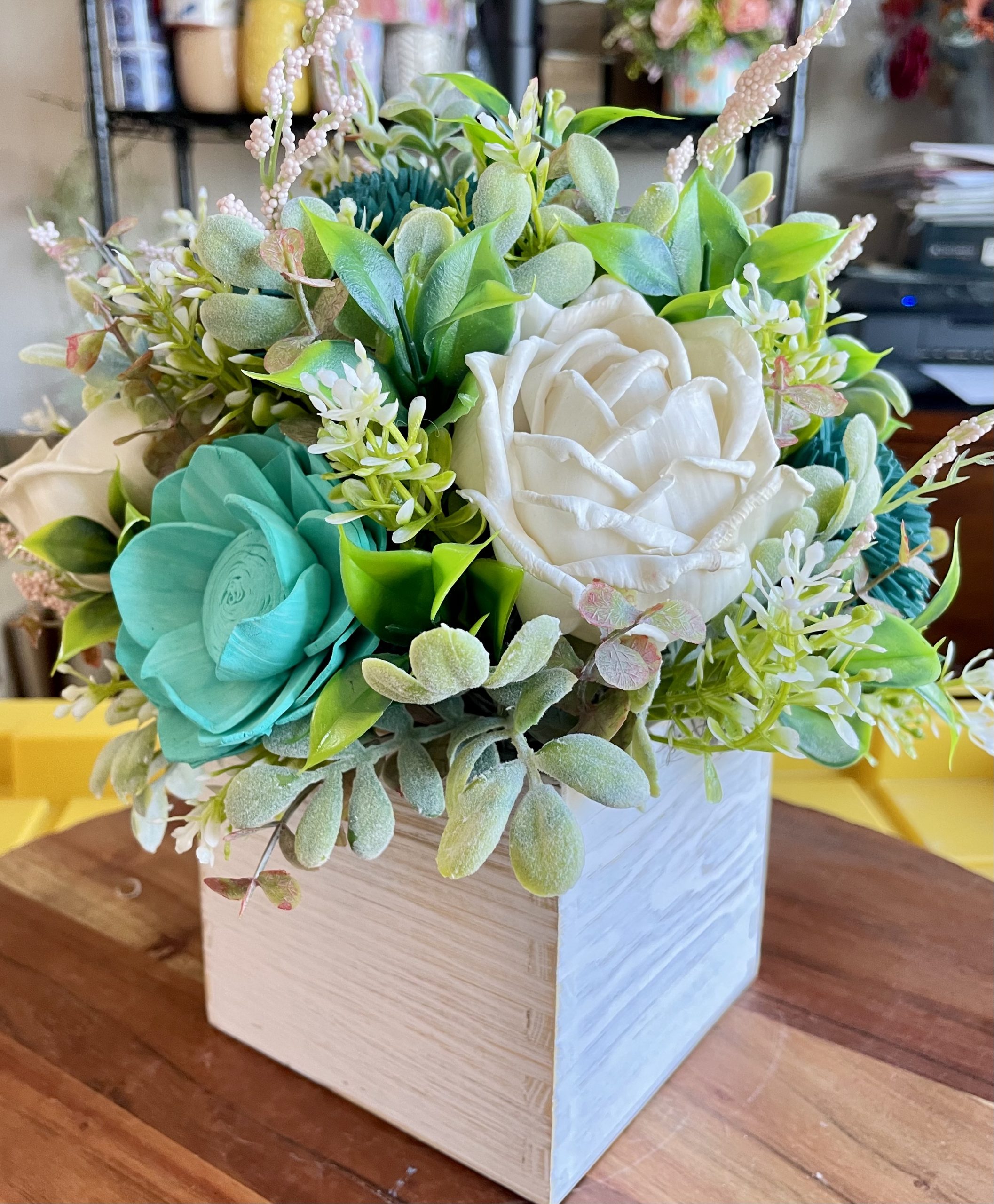 Every wood flower is carefully shaped, painted, and arranged by hand to achieve a realistic, garden-fresh look—without the upkeep of fresh flowers. The arrangement is completed with textured greenery, frosted foliage, and delicate filler stems to create fullness and dimension from every angle.