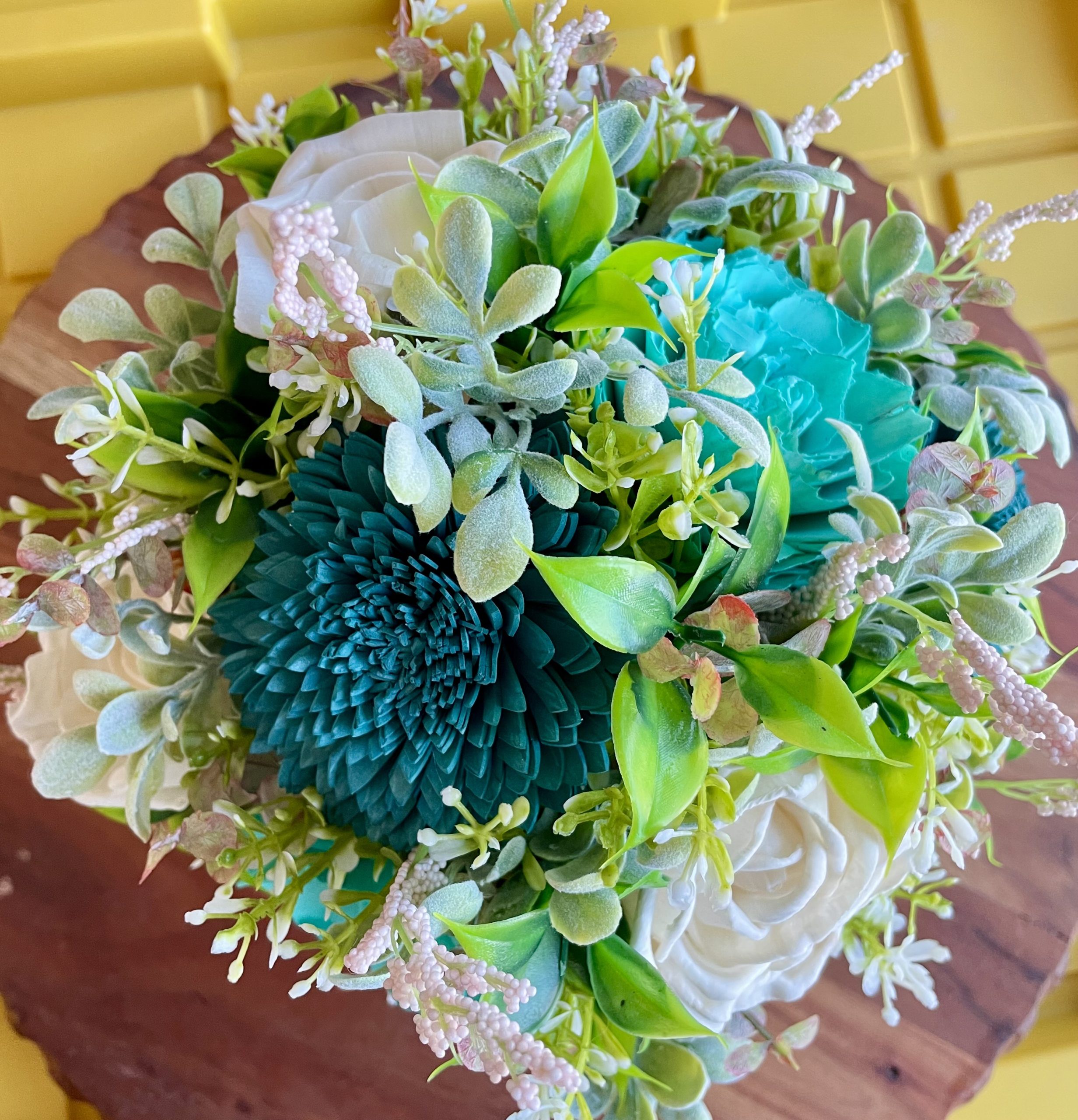 ABOUT WOOD FLOWERS: Wood flowers are individually handmade and hand painted. They will last forever as long as they are kept moisture free. To dust, we recommend using a hair dryer on low.